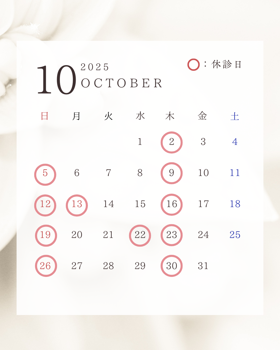 ~2025年10月の休診日~ 河合皮フ科医院 > インフォメーション > ~2025年10月の休診日~ この投稿は2025年9月30日に河合皮フ科が公開しました。 10/22は臨時休診日となります。 ご不便おかけいたしますが、何卒よろしくお願いいたします。